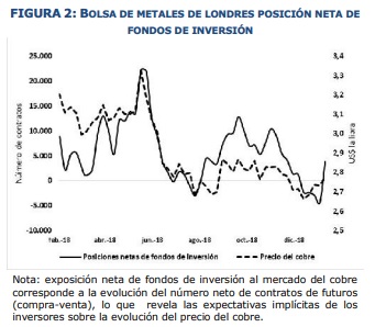 Esta semana la exposición neta (compras-ventas) de contratos a futuros de cobre por parte de los fondos de inversión que operan en la Bolsa de Metales de Londres, cambió a posición larga (compra). Esto principalmente por comentarios positivos por parte de los negociadores comerciales de Estados Unidos y China. Consecuentemente, en el alza del precio del cobre de la última semana subyace un componente especulativo relevante de corto plazo.