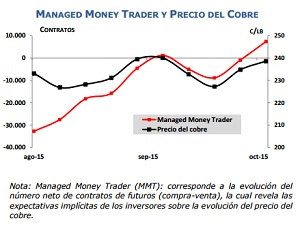 Expectativas de precio de los inversores más activos La curva Managed Money Trader de la bolsa de futuros de COMEX, evidencia que los inversores perciben un mayor optimismo en el precio del metal rojo en el corto plazo, lo cual generó que las posiciones netas de contratos a futuros sean actualmente positivas. Esto no sucedía desde inicios de septiembre.
