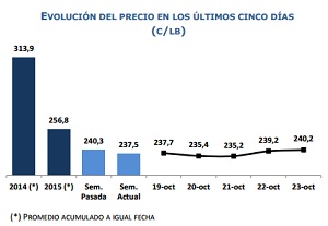 Hoy el precio del cobre se situó en 240,177 centavo de dólar la libra, anotando un leve aumento de 0,5% respecto del viernes pasado. Esta semana las noticias de China han sido determinantes para una mayor estabilización en el precio. Primeramente, la publicación de la cifra de crecimiento del PIB trimestral de 6,9% del gigante asiático ayudó a tranquilizar los mercados respecto a que el país estaría evitando un aterrizaje forzoso de su economía. Luego, al cierre de la semana, los anuncios de nuevos estímulos monetarios por el Banco Central chino y un apoyo explícito de las autoridades por estimular la economía, han sido factores relevantes para sostener el valor del metal rojo