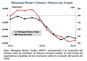 Expectativas de precio de los inversores más activos El índice Managed Money Trader (MMT) de la bolsa de futuros de COMEX muestra una tendencia estable. Consecuentemente, el precio del cobre no debería registrar fluctuaciones significativas en el corto plazo, luego de efectuada el alza en la tasa de interés por parte de la FED.