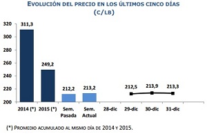 • Hoy el precio del cobre se situó en 213,3 centavo de dólar la libra, con un avance de 1,7 ¢/lb (0,8%) respecto del viernes pasado. Con ello, el precio promedio del presente año se ubicó en 249,2 ¢/lb, una baja de 19,9% respecto del promedio de 2014. Durante la presente semana el precio del metal encontró apoyo en los anuncios de fundiciones chinas de recortar producción para 2016, una leve baja de inventarios en bolsa de metales y algún efecto financiero por posiciones de cobertura de fin de año, que compensaron el leve aumento del dólar. Sin embargo, sería una tendencia de corto plazo, dado que se prevé que en 2016 el mercado mantenga la condición de superávit pese a los recortes de producción, esto ante expectativas de aumento en la oferta proveniente principalmente de Perú y la débil demanda China.