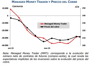 • En la última semana el índice Managed Money Trader (MMT) de la bolsa de futuros de COMEX se estabilizó en una posición de venta neta de contratos futuros, manteniendo la tendencia observada en semanas previas. La tendencia del índice MMT es consistente con la estabilización del precio del cobre, aunque permanece en un bajo nivel.