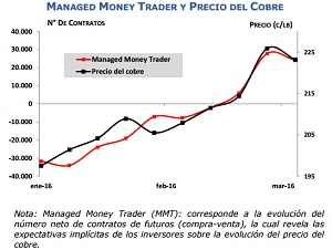 • El índice Managed Money Trader (MMT) de la bolsa de futuros de COMEX muestra que los inversores continúan posicionándose en forma mayoritaria con posiciones largas. Sin embargo, durante la presente semana se produjo un quiebre en la tendencia al alza en dichas posiciones largas, evidenciando que el precio podría haber alcanzado un techo de corto plazo.