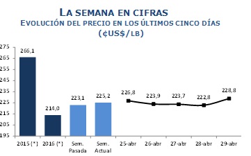 • Este viernes el precio del cobre alcanzó los ¢US$/lb 228,8, registrando un crecimiento de 0,6% respecto del viernes de la semana pasada. Este aumento se debe principalmente a la fuerte depreciación del dólar como consecuencia de la mantención de la tasa de política monetaria por parte de la FED y el PIB del primer trimestre bajo los pronósticos del mercado. Además de expectativas positivas respecto a los próximos datos manufactureros de China.