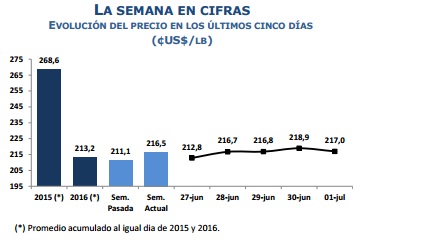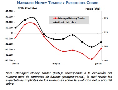 • Hoy el precio del cobre fue de ¢US$/lb 217, registrando un crecimiento de 2,6% respecto del viernes de la semana anterior. Entre lunes y jueves el precio creció debido a la reactivación de las bolsas a nivel mundial luego del BREXIT de la semana pasada. El BREXIT también deterioró las expectativas de que la FED aumente las tasas en los próximos meses, lo cual debilitó al dólar, impulsando al precio del cobre. Además, existían expectativas positivas respecto al PMI manufacturero de China dado a conocer hoy, sin embargo, la cifra decepcionó a los mercados provocando una baja del precio del metal hoy.