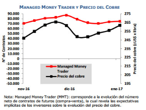 • El aumento tuvo su origen en la debilidad del dólar en un contexto en que el nuevo presidente de Estados Unidos, Donald Trump, comenzó a concretar algunas de sus promesas de campaña. Además, el PIB bajo lo esperado de Estados Unidos en 2016 podría mantener al dólar débil, impulsando aún más el aumento del precio de los commodities. Por su parte, China dio a conocer indicadores favorables para su economía, además de medidas que apuntan a la estabilidad del sistema financiero del país. Además, existe un potencial riesgo de huelga en Minera Escondida, lo cual también ha incidido en el precio del cobre.
