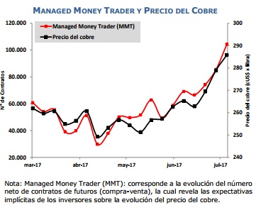 -Las importaciones de cobre por parte de China registraron un alza de 8,3% en julio 2017 respecto del mismo mes del año anterior. Sin embargo, en el periodo enero-julio acumulan una baja de 15,2% respecto del mismo periodo de 2016. La tasa de julio (8,3%) es consistente con mejores expectativas de demanda para el segundo semestre del presente año.