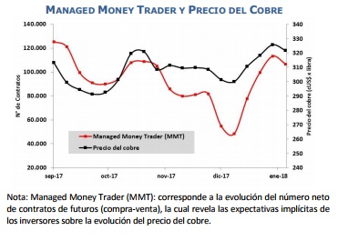 Hoy el precio del cobre retrocedió 0,4% respecto del viernes de la semana pasada situándose en US$ 3,21 la libra, situación inducida principalmente por la baja del dólar. Los positivos datos económicos de China y la percepción de vulnerabilidad de la oferta del metal en 2018, consecuencia del elevado número de negociaciones colectivas previstas en Chile y Perú, están dando un soporte sólido a los fundamentos del precio del metal. Sin embargo, los inversores que son determinantes en el nivel del precio spot están siendo moderadamente cautos, tomando ganancias y consolidando posiciones más que aumentando su exposición al metal en el corto plazo. Esta semana Cochilco difundió la proyección del precio del cobre para los años 2018 y 2019, previendo un promedio de US$ 3,06 y US$ 3,11 la libra respectivamente. Estados Unidos: la construcción de viviendas, un importante inductor de demanda de cobre, presenta expectativas poco favorables para la primera parte del presente año