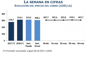 Esta semana el precio del cobre cerró en US$ 3,08 la libra levemente por debajo del viernes pasado. Sin embargo, el promedio semanal presentó una caída de 5,3 centavos de dólar la libra (-1,7%) donde concurrieron los siguientes factores: