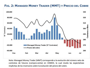 Hoy el precio del cobre se situó en US$ 2,73 la libra, es decir 0,3% mayor al registro del viernes pasado. Los comentarios del presidente de EE.UU. respecto de la probable salida del país de la OMC y la aplicación de nuevos aranceles a productos chinos en septiembre próximo, que afectarían a importaciones por US$200.000 millones, generaron una baja acotada en el precio del metal rojo. Esto debido a que las expectativas de los inversores en cobre, que han mantenido una fuerte posición vendedora por siete semanas consecutivas, evidencian que el actual nivel del precio del cobre ya incorpora parte relevante de dicho efecto. Sin embargo, los riesgos para el metal se están elevando, principalmente por el deterioro de las expectativas de crecimiento de China, como lo sugirió el comunicado de la Comisión de Desarrollo y Reformas de dicho país la presente semana. Asimismo, la tendencia a la apreciación del dólar y consecuentemente, el debilitamiento del yuan agregan presión a la baja al precio del metal en el corto plazo. Estados Unidos: aumenta la probabilidad que se profundicen las tensiones comerciales con China durante septiembre.