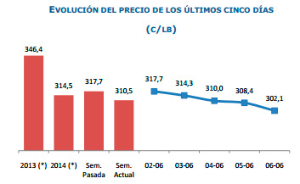 MERCADO INTERNACIONAL DEL COBRESemana del 2 al 6 de junio de 2014NOTICIAS DE LA SEMANA CON IMPACTO EN EL PRECIO DEL COBRECOMPORTAMIENTO DEL PRECIO DEL COBREDurante la semana del 2 al 6 de junio, el precio registró tendencia a la baja, inducida por expectativas que en Indonesia se reanudarían las exportaciones de concentrados de cobre que habían sido paralizadas a principios de año por la aplicación de un impuesto. En tanto, en China se inició una investigación en el puerto de Qingdao, donde se detuvieron embarques de cobre y aluminio que servían de garantía para la obtención de créditos, lo cual ha limitado este tipo de operaciones que han ayudado a sostener la demanda.