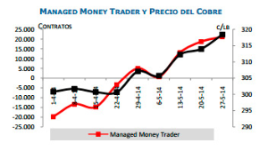 El Banco Central Europeo redujo la tasa de política monetaria a niveles históricos desde 0,5% a 0,15% y bajó la tasa marginal de créditos a un día a -0,1%. Por primera vez el BCE cobrará a la banca por dejar fondos inmovilizados, induciendo al sistema financiero a traspasar recursos a empresas pequeñas y medianas e incentivar el consumo, reduciendo de esta forma el riesgo de deflación. EXPECTATIVAS DE LOS INVERSIONISTAS MÁS ACTIVOS El indicador Managed Money Trader de la bolsa de futuros de COMEX, hasta la semana anterior, evidenció un fortalecimiento en la posición de compra neta de contratos futuros. Situación que en la presente semana tendió a revertirse dada las expectativas de mayor oferta de metal. DETALLE DE INVENTARIOS EN BODEGAS Al cierre de la semana del 2 al 6 de junio, los inventarios en las Bolsas de Metales continuaron con la tendencia a la baja, registrando una caída de 3,5%, equivalente a poco más de 9.600 toneladas. Los actuales niveles de inventarios representan 4,7 días de consumo. En lo que va del año la disminución de inventarios en las Bolsas acumula una disminución de 46,9% equivalente a 238 mil toneladas.