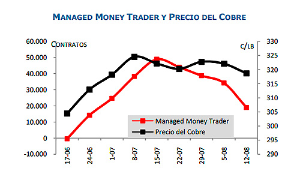El indicador Managed Money Trader de la bolsa de futuros de COMEX mantiene la tendencia a la baja, siendo más pronunciada que semanas previas, anticipando perspectivas menos favorables para el precio del cobre en las próximas semanas.