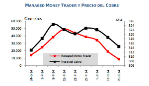 El indicador Managed Money Trader de la bolsa de futuros de COMEX profundiza la tendencia a la baja respecto de la semana previa, revelando perspectivas menos favorables para el precio del cobre en el corto plazo.