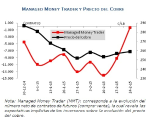 Al cierre de la presente semana los inventarios en las Bolsas de Metales registraron un alza de 47.374 toneladas, equivalente a 9,2% respecto del viernes de la semana pasada. A la fecha los inventarios acumulan un aumento de 261,3 miles de toneladas de cobre fino, equivalente a un alza de 86,1% respecto del cierre del año 2014. Por su parte los warrants cancelados, indicador que en general anticiparía las salidas de inventarios, respondiendo principalmente a las expectativas de demanda, registró un alza de 96% respecto del viernes pasado, alcanzando un nivel de 4.925 toneladas, equivalente al 14,8% de los stocks disponibles en bodegas de la Bolsa de Metales de Londres.