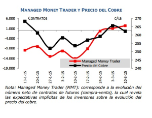 Expectativas de precio de los inversores más activos. El indicador Managed Money Trader de la bolsa de futuros de COMEX muestra que los inversores fortalecieron la posición neta de demanda de contratos de futuros, lo que sugiere un ciclo más positivo para el precio, apoyado por señales de un alza más gradual de la tasa de interés en EE.UU.