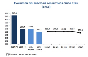 Hoy la cotización del cobre retrocedió 10,2 centavos de dólar la libra respecto del viernes pasado (-3,8%). Esta tendencia se explica, principalmente, por el alza del dólar frente al euro debido a la incertidumbre que genera la compleja situación griega, aumentando en la presente semana la probabilidad que abandone la unión monetaria, lo que podría concretarse a fines de junio para cuando está programado un pago de deuda al FMI.
