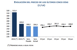 Hoy la cotización del cobre aumentó 3,1 centavos de dólar la libra respecto del viernes pasado (1,2%). En ello influyeron las positivas cifras de consumo en EE.UU y un moderado optimismo respecto de las negociaciones programadas para este sábado entre Grecia y sus acreedores, que evitaría la cesación de pagos la próxima semana. También los mejores índices de actividad industrial en China sugieren un impacto incipiente de las medidas de estímulos monetarios.